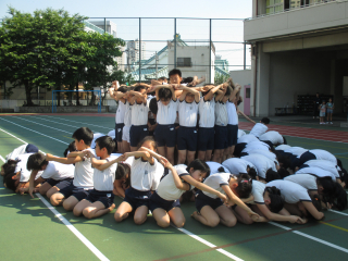 運動会の練習が始まりました。1年生は体操の隊形になって、自分の立つ場所を覚えることにまず時間がかかってしまいました。最初は座って、手の動きだけを覚えました。「腕を前から回すのか、後ろから回すのか、頭の後ろまでもってくるのか、手首だけでまわすのか。」一人一人バラバラでしたが、練習とともに少しずつそろってくることでしょう。とにかく楽しそうにやっていたので良かったです。