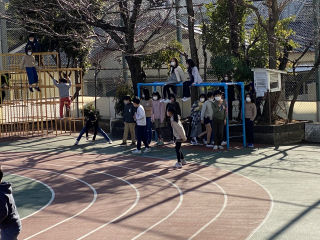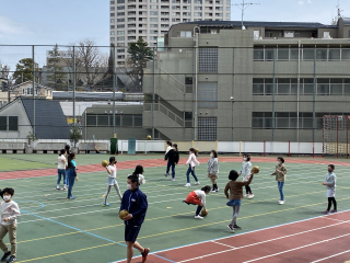 学年みんなで仲良く、ドロケイやてんか、バスケットボールをして遊んでいました。