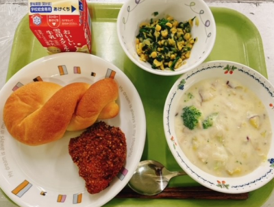 デザートは牛乳をつかったくずもちです。牛乳には丈夫な骨や歯をつくるためのたんぱく質やカルシウムがたっぷりと詰まっています。6月1日は「牛乳の日」です。どうして、給食には毎日牛乳がつくのだろう?そもそも牛乳ってなんだ?などを考えてみませんか。牛乳とSDGsの関係も考えてみましょう。