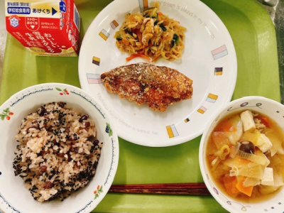今日はお赤飯です。どうしてかというと、1年生を迎える会があるからです。お赤飯は「1年生のみなさん入学おめでとう。これからよろしくね」という「お祝いの気持ちを表す」行事食です。赤い色には魔を払う力があると言われ、昔からお祝いの時に食べられてきました。1年生が悪いことをしないように、危険なことに合わないように、おにいさんお姉さんとしてお手本を見せられるといいですね。 ぶりは出世魚と呼ばれています。みなさんが1年生から「あんなお兄さん、お姉さんになりたい!」と憧れられるような存在になれるように給食室からも応援しています。