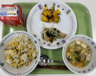 今日から1年生もほかの学年さんと同じ献立になります。お皿も3種類になりましたが上手にお盆にのせて運べたでしょうか?全部のお皿が空っぽになるように食べると元気に大きくなれます。食缶も空っぽになると嬉しいです。今日もよく噛んで味わっていただきましょう。