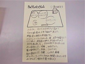給食には、みなさんが元気に育ってほしいという願いと、みなさんが大人になった時にも幸せに生活してほしいとの願いが込められています。みんなの気持ちを考えながら、今日もよく噛んで味わっていただきましょう。