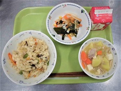 9月19日は敬老の日です。おじいさんやおばあさんなどに「ありがとう。これからも元気にすごしてね」という感謝の気持ちを伝える日です。そこで、給食でも、元気に長生きするのに役立つ料理を組み合わせた献立にしました。おじいさん、おばあさんにも「こんなものをたべるといいよ」と教えてあげましょう。今日もよく噛んで味わっていただきましょう。