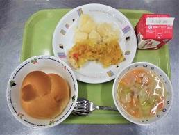 【きゅうしょくつうしん】みなさんにとって「平和」とは、どんなことでしょうか。今日、3月10日は「東京都平和の日」です。今から77年前の昭和20年3月10日、東京はアメリカ軍による空爆を受けました。東京大空襲です。今、スカイツリーがある地域を中心に、東京全体で約10万人の大切な命が失われました。当時の食事はどのような内容だったでしょうか。食べることはできていたでしょうか。「すいとん」も、今日の給食のような「具」はほとんどなかったと思います。今日は「平和」について考えながら、噛みしめて食べてほしいと思います。