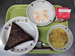 【きゅうしょくつうしん】柿のおいしい季節になりましたね。鮮やかな「柿色」のもとは、にんじんやみかん、そしてトマトと同じ物質です。風邪を予防したり疲れをやわらげたりする栄養素が多く含まれていることから、「柿が赤くなると医者が青くなる」とも言われています。この意味、わかりますか?今日の柿は、奈良県産です。よく味わって食べましょう。
