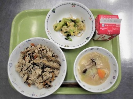 磯ご飯、牛乳、肉じゃが、海苔のサラダ