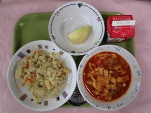 【きゅうしょくつうしん】パエリアは、スペインの料理です。お米と肉や魚介、野菜などを炒めて煮込んで炊き上げる料理で、お皿のような平たい鍋「パエリア」を使うことから、この名前がついています。今日のパエリアは、あさりやえび、いかなど、海の幸たっぷりです。あさりは、熊本県産です。よくかんで味わって食べましょう。