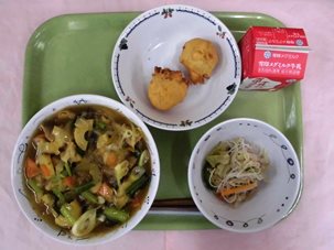 ご飯、牛乳、回鍋肉、丸ごとわかめスープ