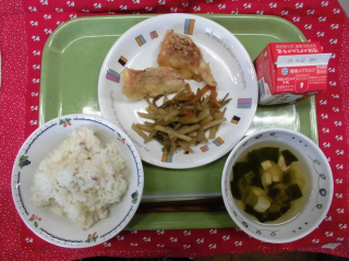 磯ご飯、牛乳、豚肉と里芋の炒め煮、のりのサラダ、みかん