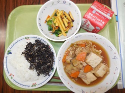 ★1年生は、今国語で「かきとかぎ」という学習をしています。ひらがな二文字の言葉の一文字に濁点がつくことで違う言葉になるというもの。教科書には「ふた」と「ぶた」、「こま」と「ごま」などが示されています。「ほかにどんな言葉があるかな」という担任の問いかけに、「『ふき』と『ぶき』」という発言があったそうです。この学習のあった今日、山菜ご飯にふきが登場したのは偶然でしたが、教室では「これだ!」と嬉しそうにふきを見つけて食べていたそうです。