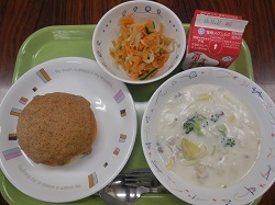 【きゅうしょくつうしん】「きんぴら」でおなじみのごぼうをピラフにしました。ピラフの中には細かく切ったごぼう、そして、トッピングもごぼうチップスです。ごぼうの香りと歯ごたえを味わってほしいと思います。「つぶつぶコーンポタージュ」は、小麦粉のルゥではなく米粉でとろみをつけました。牛乳ではなく豆乳を使っているので、優しい甘さになっていると思います。メロンは茨城県産です。よく味わって上手に食べましょう。