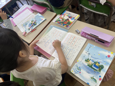 ノートに書く学習も数回目で、たくさんの文字や言葉を書いています。マス目に合わせて綺麗に書いたり、次のページに書く際の下敷きの入れ替えも早くなりました。一つ一つの動作も毎日繰り返し行うことで、素早く丁寧にできるようになっています。