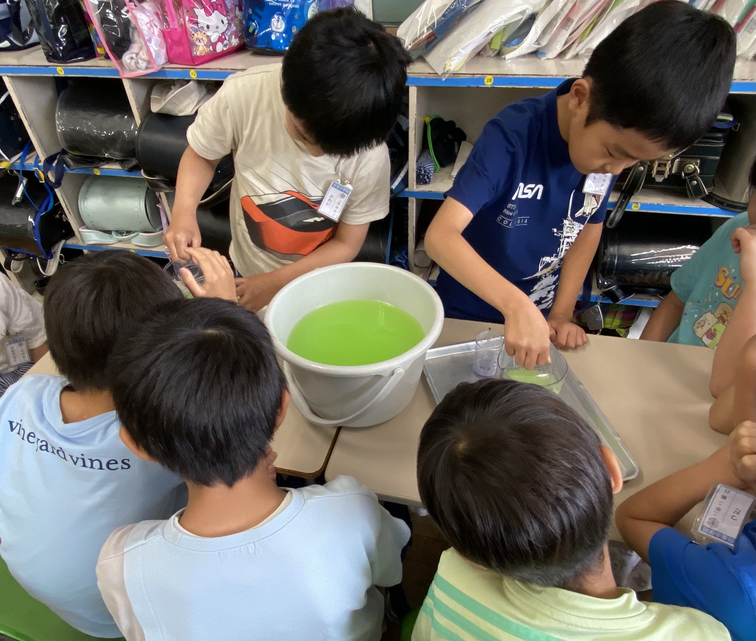 水のかさ 実験 2024年7月2日 08時06分 算数では、水のかさを学習しました。 1Lは、1dLマス10はい分ということを実際に色水をいれて確認をしました。 「メモリを上から見るのと、正面から見るのと、下から見るのは、ちょっと変わる!」と正しい見方の大切さにも気付いていました。 水がこぼれないように声を掛け合いながら、また、友達がこぼしてしまってもそっと拭いてあげる優しさいっぱいの2年生でした。