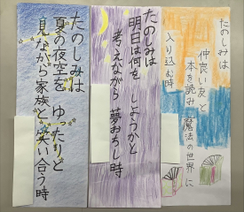 完成した短歌を見てみると、習い事に熱中する時、友達と笑い合う時、アイスを頬張る時など、様々な「たのしみ」があり、個性豊かな作品に、その子らしさが溢れていました。
