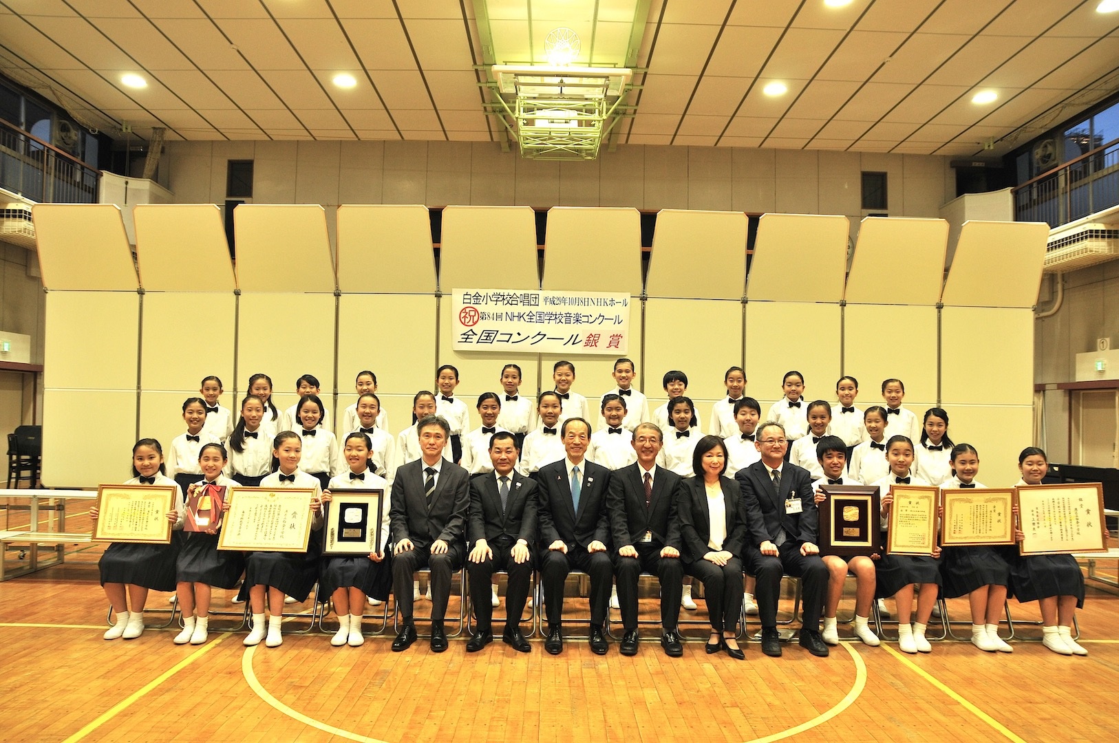 11月7日(火)に武井港区長が、合唱団全国コンクール銀賞受賞のお祝いに来校されました。武井区長からは表彰状と港区産のはちみつをいただきました。一人一人握手をしていただいたり、一緒に「ふるさと」を歌ったり、とても和やかな会になりました。